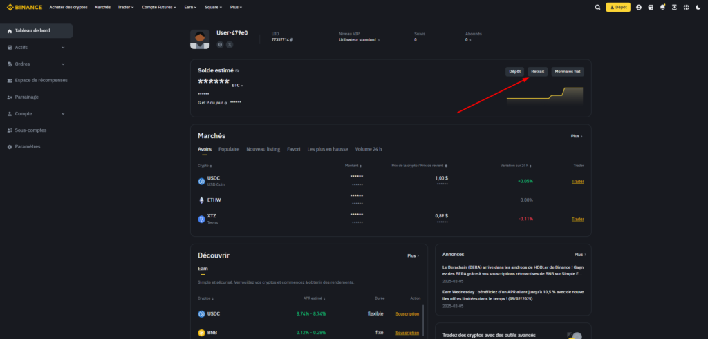 Rendez-vous sur votre tableau de bord et sélectionnez le bouton “Retrait” :