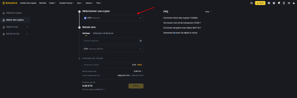 Une nouvelle page s’affiche. Sélectionnez la crypto que vous souhaitez retirer grâce au menu déroulant. J’utiliserai de l’Ether (ETH) pour ma démonstration mais le processus est le même pour n’importe quel token, ne vous inquiétez pas.
