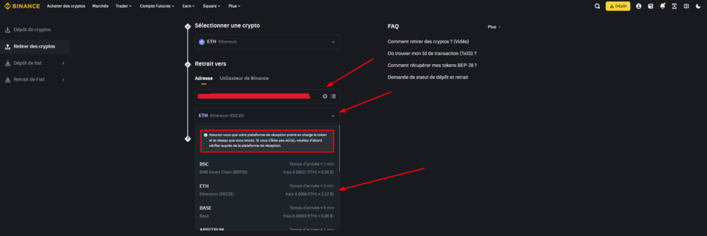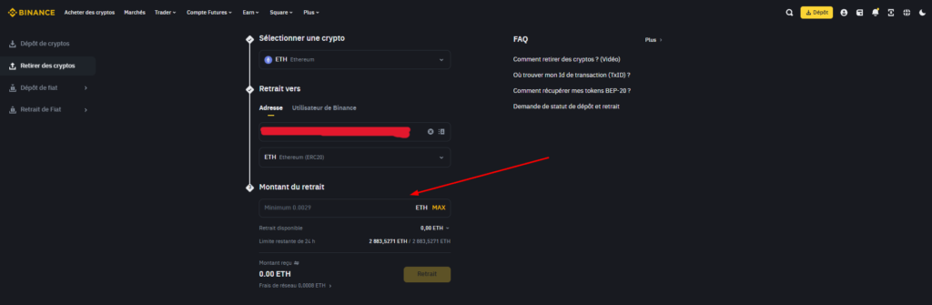 Une fois que cela est fait, vous pouvez revenir sur Binance et entrer l’adresse en question dans la section prévue à cet effet.