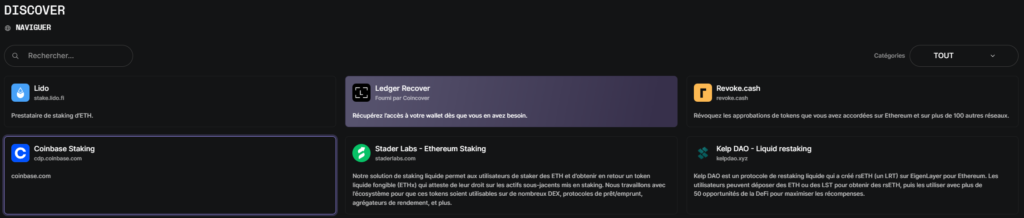 Ensuite, pour aller plus loin et faire fructifier vos cryptomonnaies tout en bénéficiant de la sécurité offerte par Ledger, tout se passe via l’onglet « Discover ». Ici, vous pourrez télécharger des applications en fonction de vos besoins, que ce soit pour profiter de la finance décentralisée (DeFi), pour bénéficier d’outils comme les swaps, pour gérer vos tokens non fongibles (NFT) et bien d’autres choses encore.